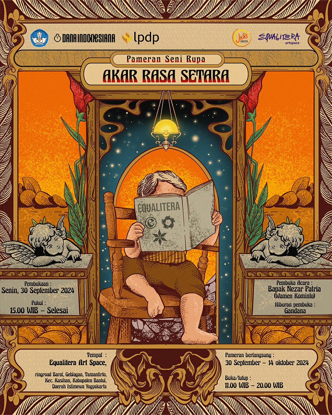 Yayasan Jogja Disability Arts (JDA) – EQUALITERA ARTSPACE, Jalan Ringroad Barat, Geblagan, Tamantirto, Kasihan, Bantul 55182 ☎ 0896 73413391. Wakil Menteri Kominfo Nezar Patria, S.Fil., M.Sc., M.B.A, akan membuka Pameran “Akar Rasa Setara”, pada Selasa 30 September 2024, Pukul: 15.00-17.30 WIB. Sebuah pameran yang diselenggarakan dalam rangka Soft launching Equalitera Artspace. Diinisiasi Yayasan Jogja Disability Arts dengan dukungan KEMENDIKBUD, melalui Dana Indonesiana. Pameran dibuka untuk umum, mulai 30 September – 14 Oktober 2024, setiap hari pada 10.00 – 20.00 WIB.